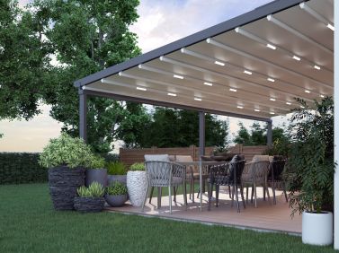 U lamelové střechy si sami určíte, kolik slunce a světla chcete na terase mít. Střechu lze otevírat a zavírat pomocí dálkového ovládání, což vám umožní sedět v suchu i za nepříznivého počasí. Můžete si vybrat ze dvou typů hliníkových lamelových střech: s výklopnými panely a s panely, které lze posunout do strany.